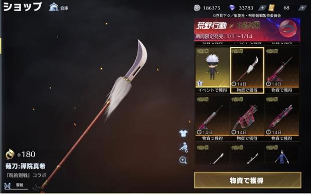 | 薙刀:禪院真希入手方法 | 呪術廻戦コラボ限定ガチャで獲得(0.195%) 交換ショップで交換(70枚) |