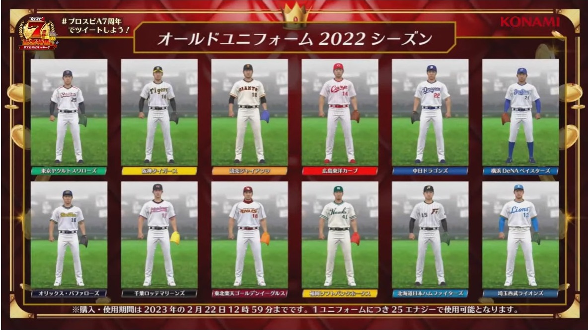 10/21より、全球団のオールドユニフォームが実装となっています!「メニュー」→「ショップ」→「プレミアムストア」にて、1ユニフォームにつき、25エナジーで購入することが出来ます。