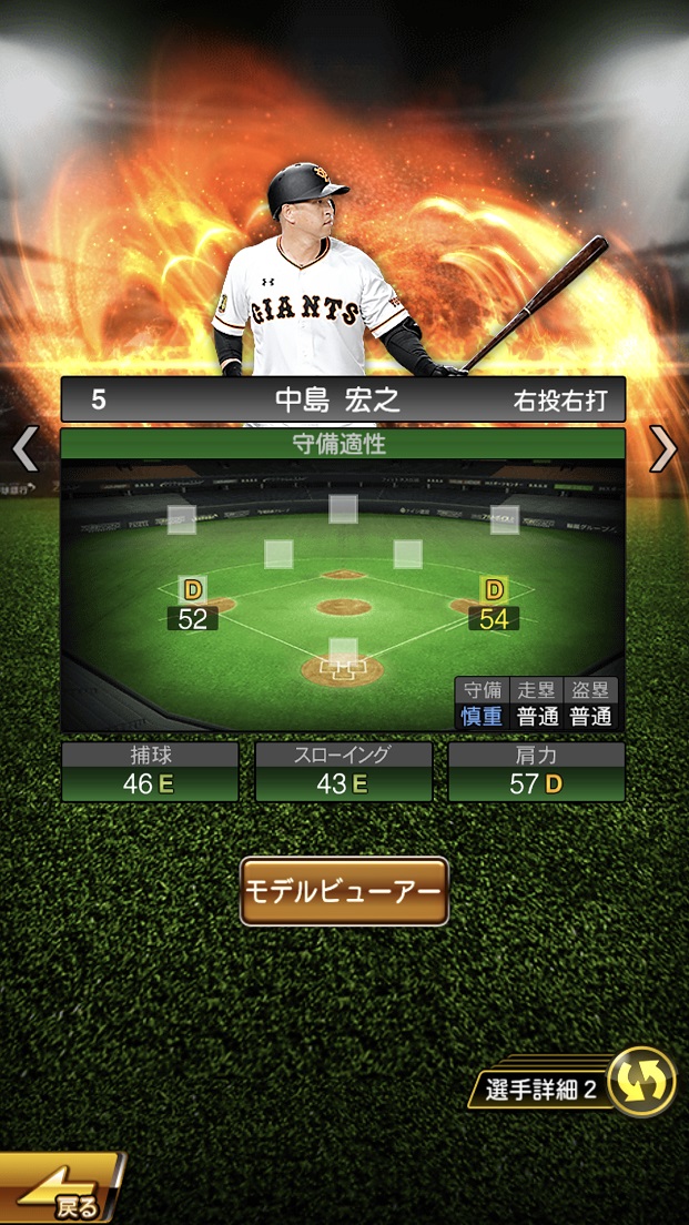 中島宏之選手の打撃能力は、ミート66(C)・パワー66(C)・走力54(D)でミートとパワーが同値になっています。昨年はTS(西武)で登場、通常Sランクで出るのは2018シリーズ2(オリックス)以来となりました。