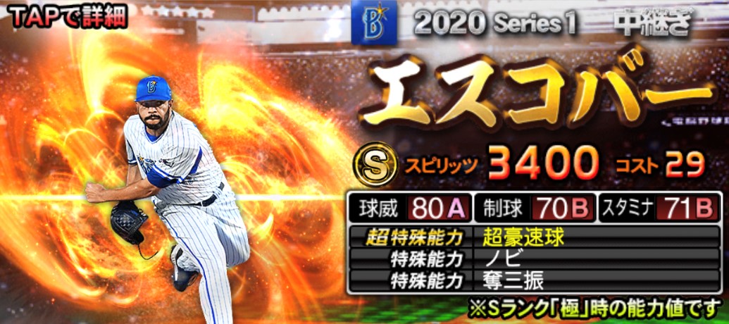 球種は156km/hの威力のあるストレート、縦スライダー・カーブ・チェンジアップはいずれも変化値5となっており、自操作にも向いています。