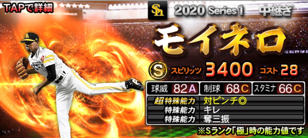 モイネロ選手は、球威がAと高いのが特徴で、称号で制球もBにすることが出来ます。投球能力は悪くありません。