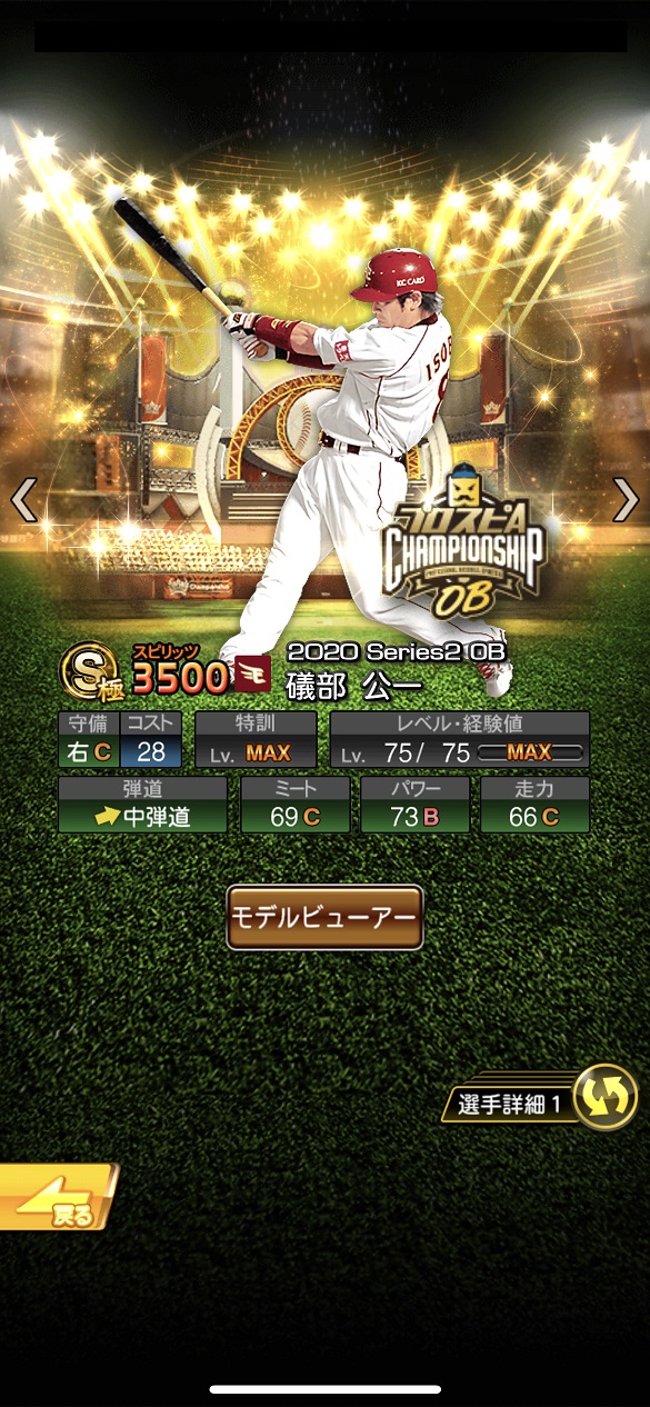 磯部選手は2005年で登場しました!ステータスはパワーBで、弾道は中弾道となっています。