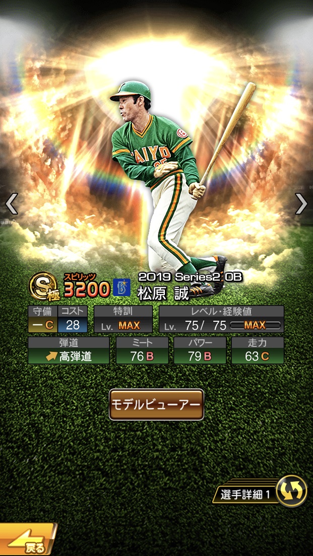 松原誠選手の打撃能力は、ミート76(B)・パワー79(B)・走力63(C)のパワー型となっています。